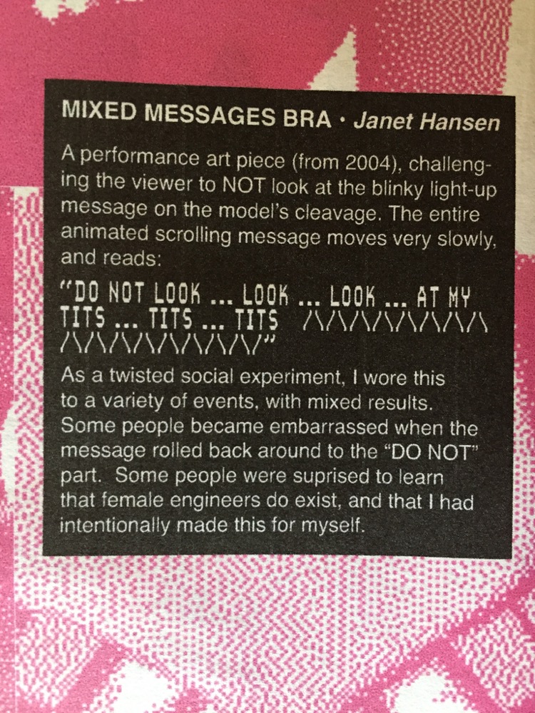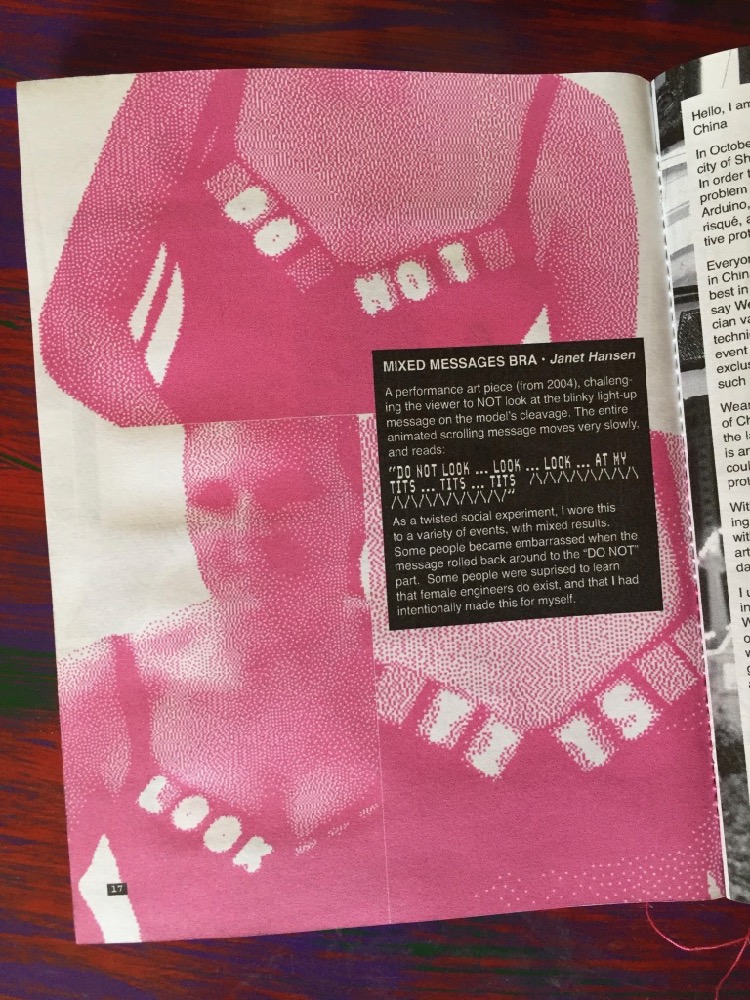 Janet’s “mixed messages” bra was included in this collection of electronics-based projects that address social issues in a subversive way. The booklet was produced in early 2017 by Vancouver-based artist Garnet Hertz, and more information about the project is available on the Disobedient Electronics website.