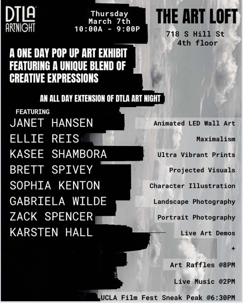Other artists includ Ellie Reis (maximalism), Kasee Shambora (ultra vibrant prints), Brett Spivey (projected visuals), Sophia Kenton (character illustration), Gabreila Wilde (landscape photography), Zack Spencer (protrait photography), and Karsten Hall (live art demos).