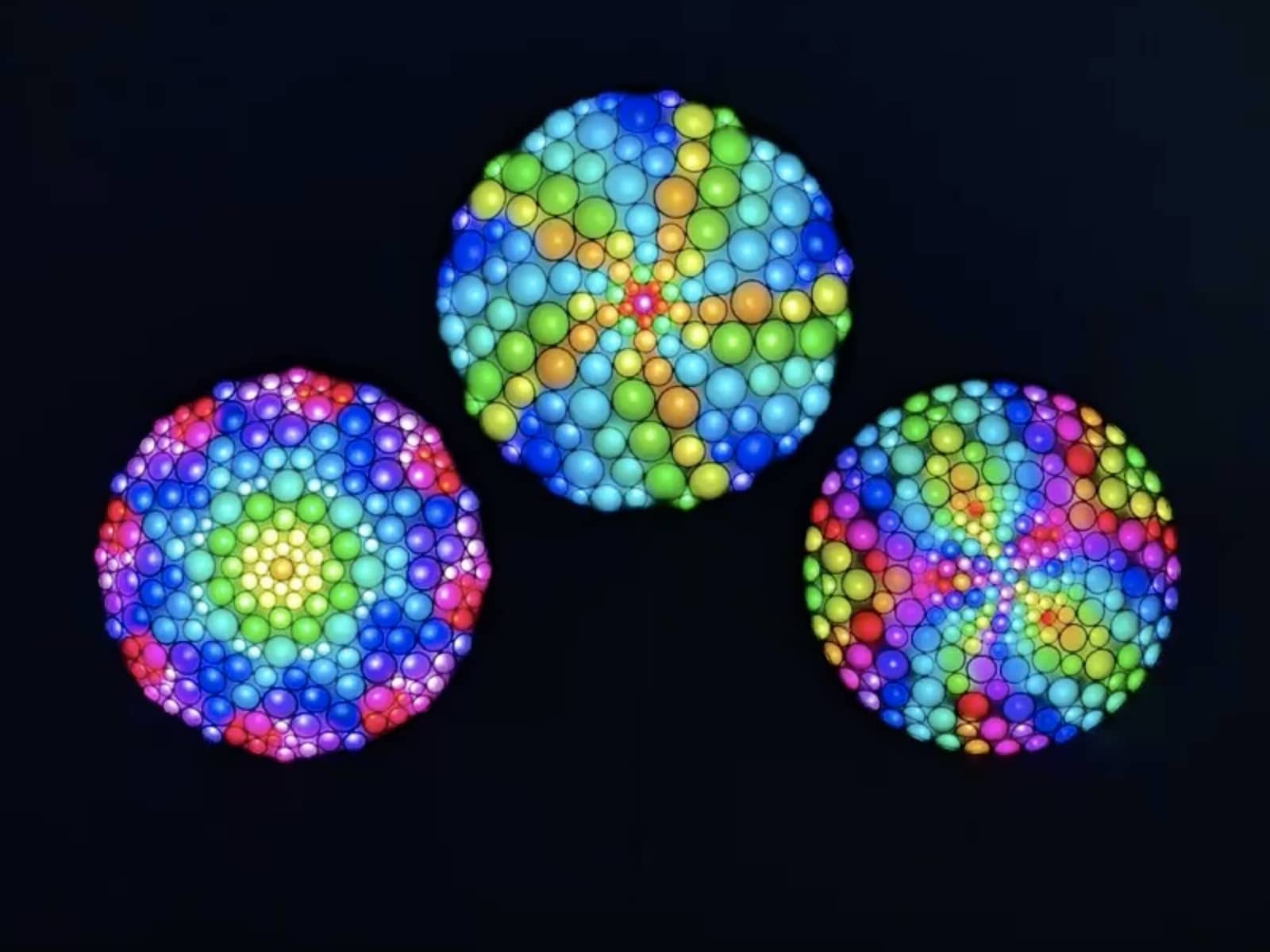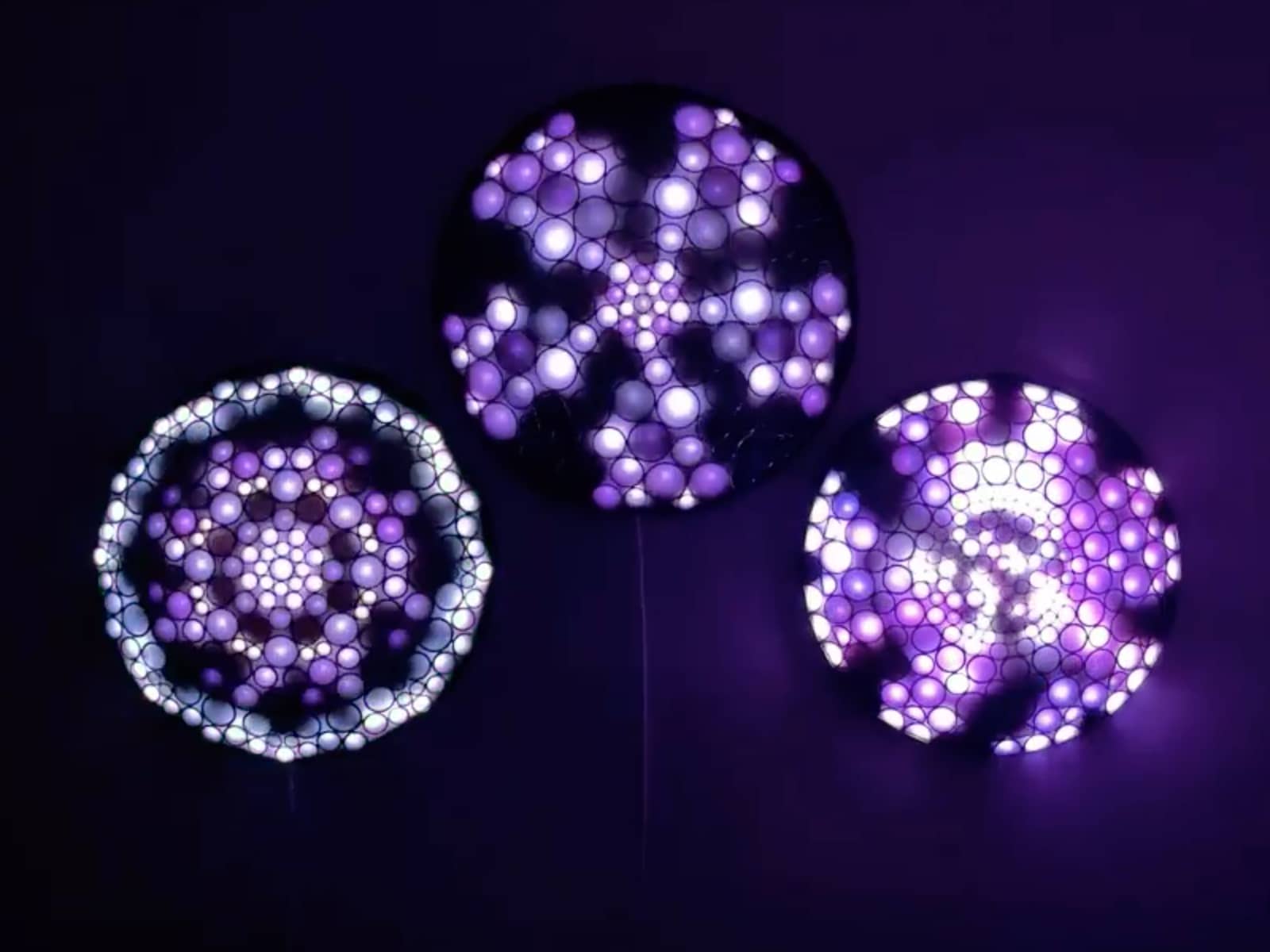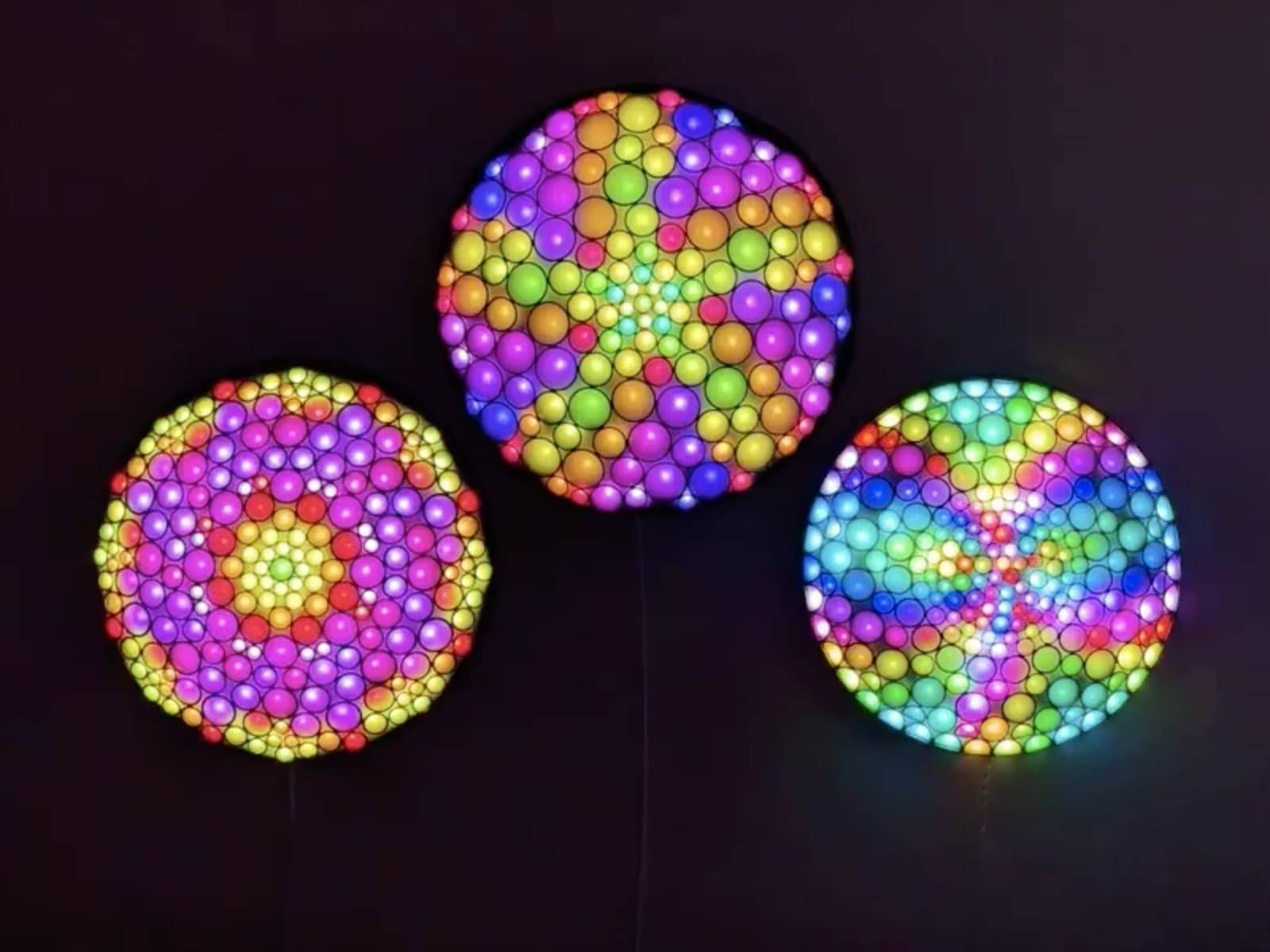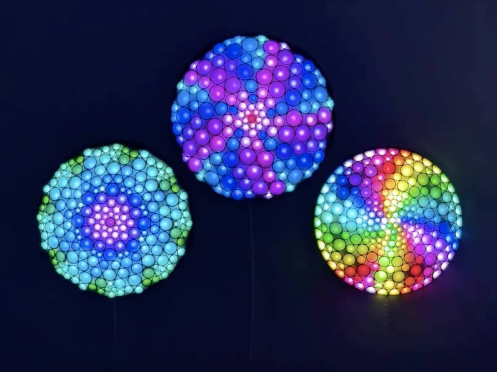 The Illuminated Rings series explores different geometric arrangements of metal rings with embedded animated RGB LED backlighting. These pieces can be enjoyed as individual units, and many can also be displayed as synchronized groups that display a timed sequence of matching effects. The color changes are similar, but the underlying pixel mapping in each piece varies with the type of geometric symmetry within the design. Viewing several pieces simultaneously can help to amplify these differences.