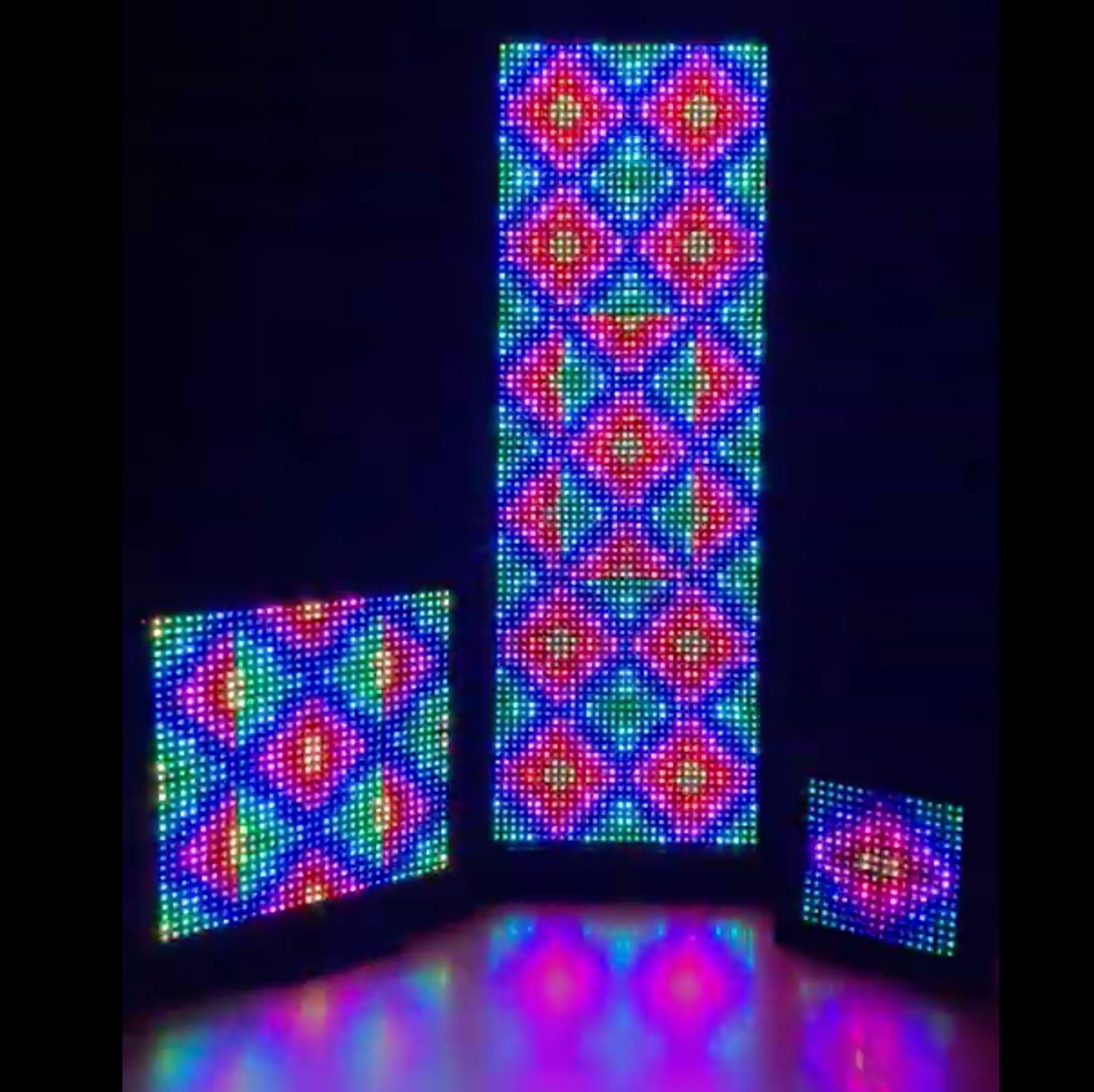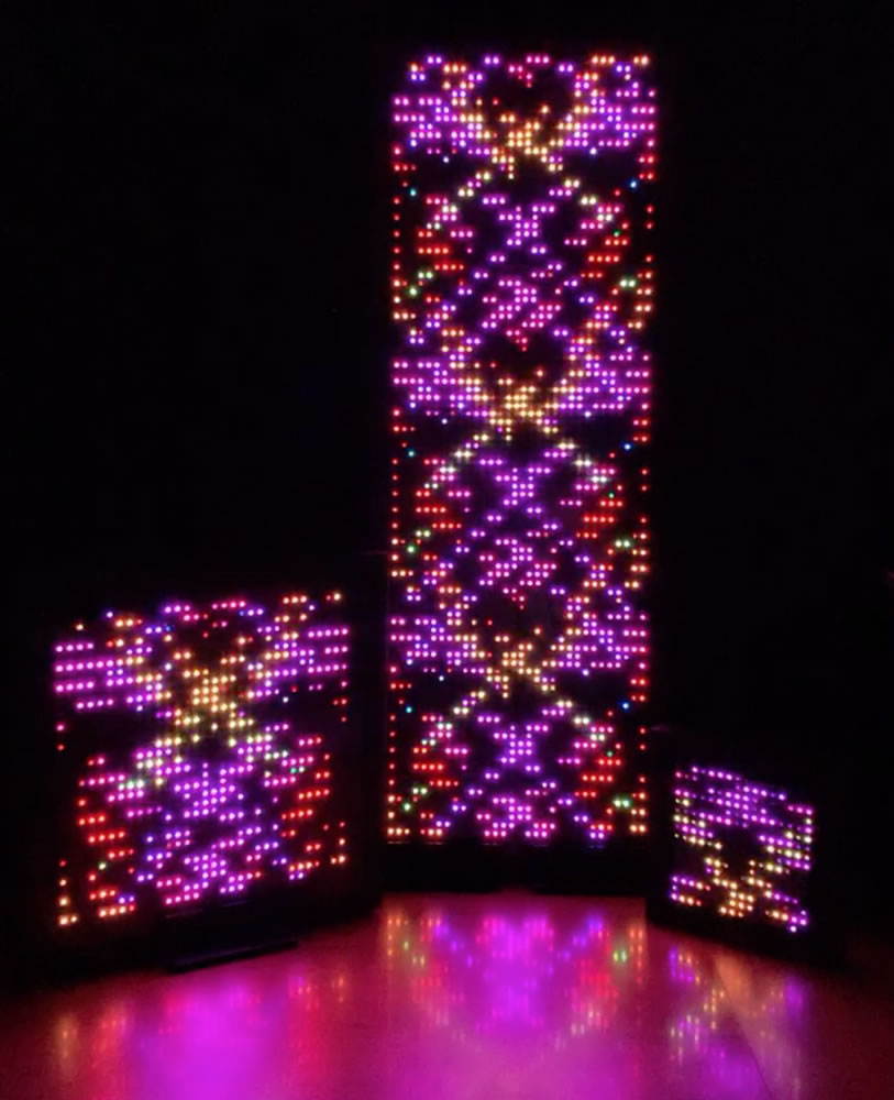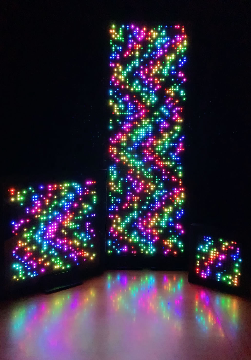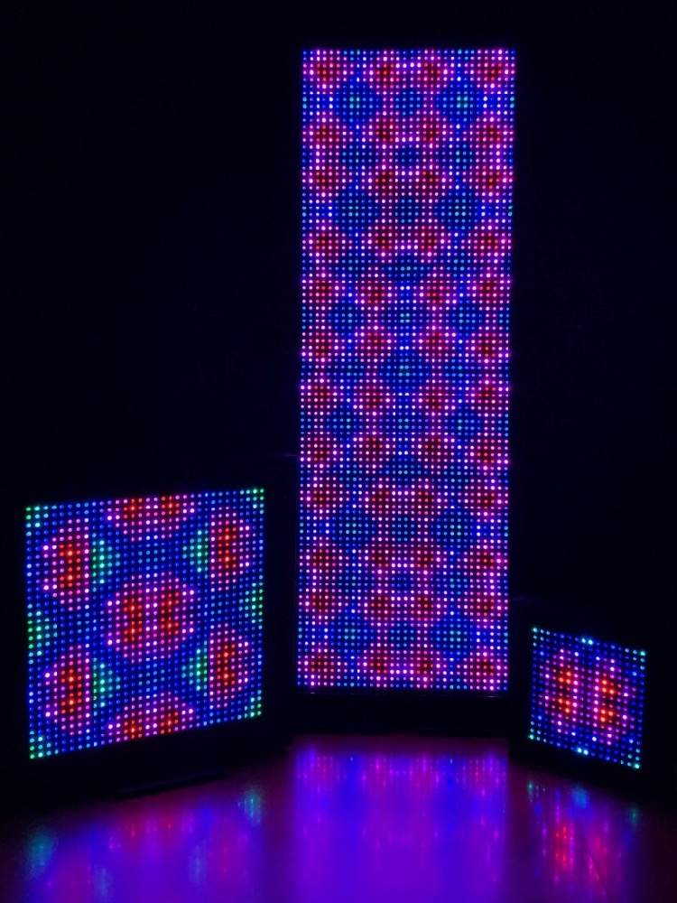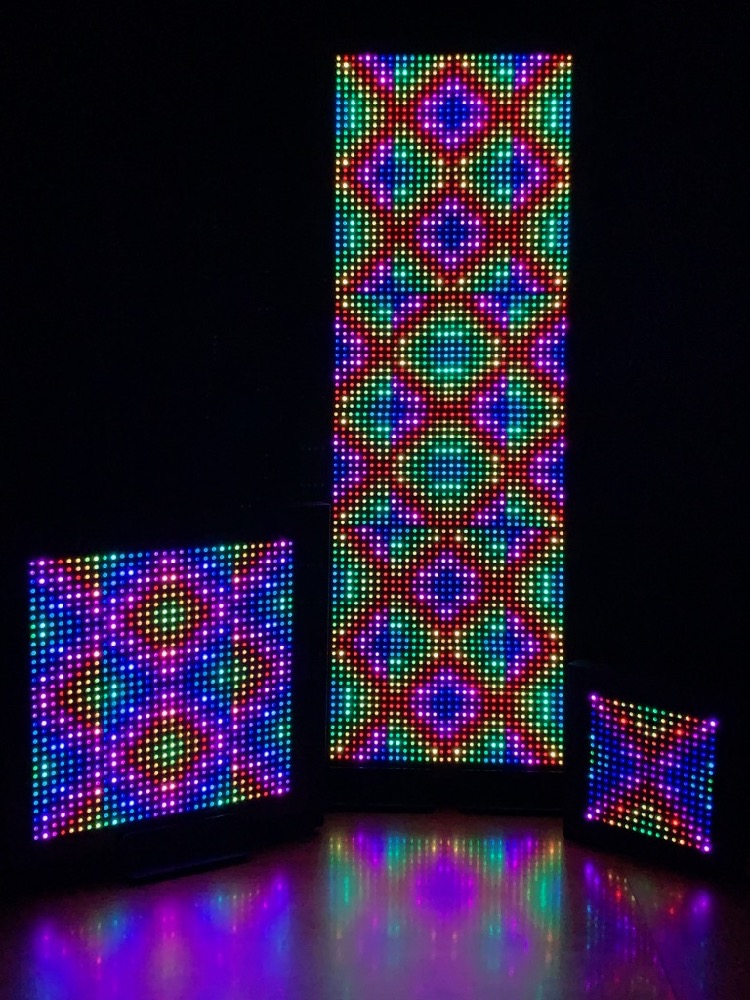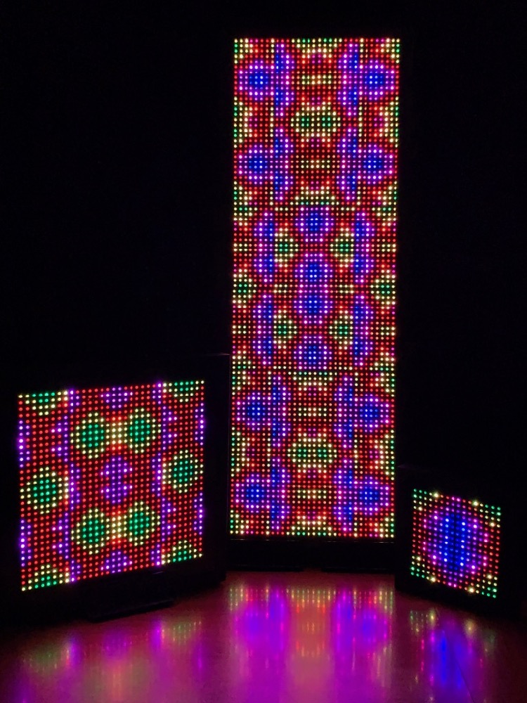 These framed illuminated panels display multi-color geometric patterns that can be customized to match your mood, whether you want a high-energy dance party, or a chill space where you're just relaxing and sitting (and possibly staring).  They contain dense grids of individually adressable RGB LED pixels, and are controlled by the same LED drivers that I've developed over the years for my custom lighted clothing, but without the pesky requirements of being flexible, washable, or fitting a specific person.