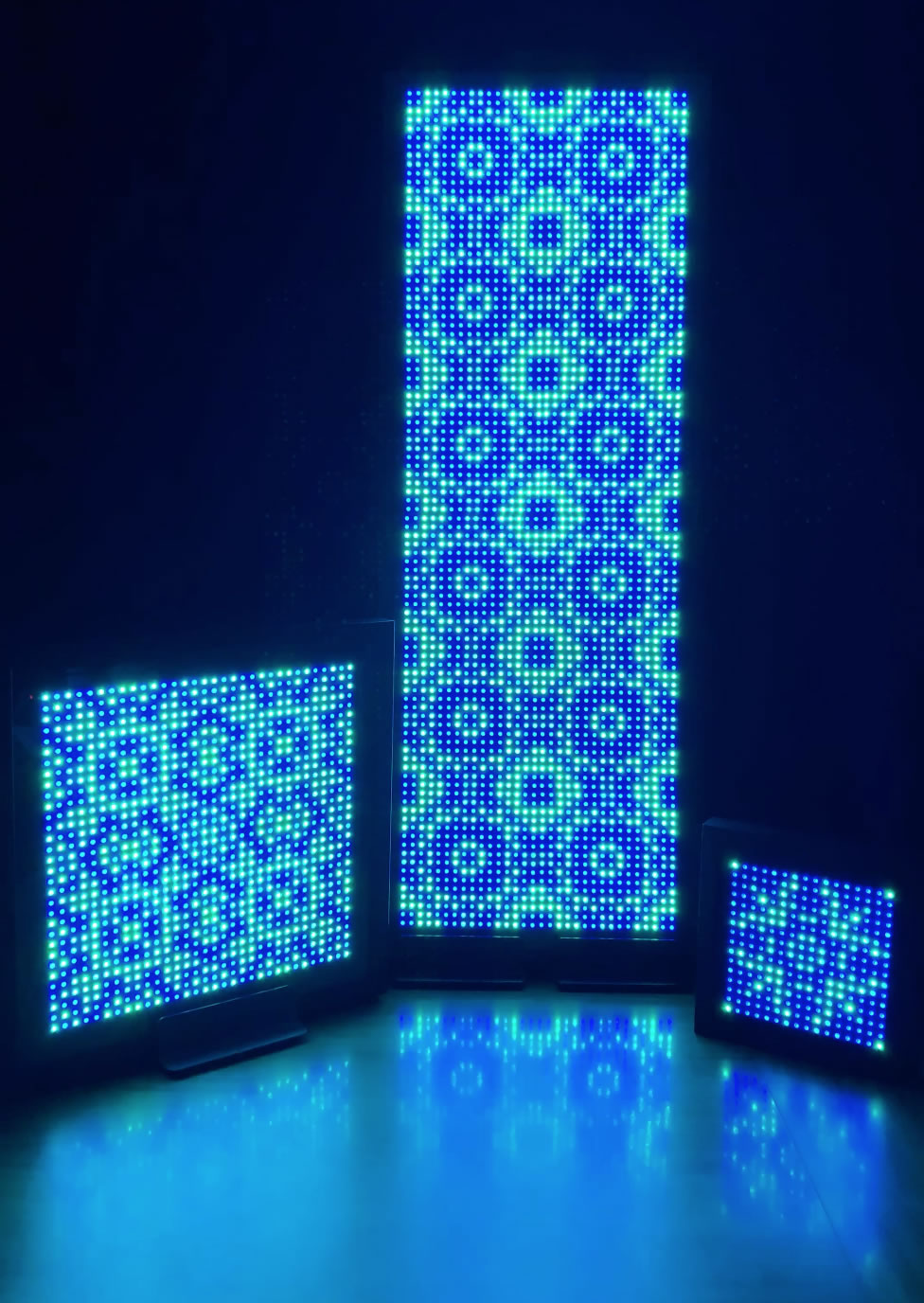 This project is inspired by the original Sit 'n Stare panels, made in 1999. Back then, blue LEDs were not yet affordable, so I had to settle for a design with red, amber, and green LEDs arranged in groups, with only 12 independent channels per 6" repeating unit. Twenty years later, I'm still a fan of the retro tiled/geometric aesthetic, but I'm excited to have so many new color options.