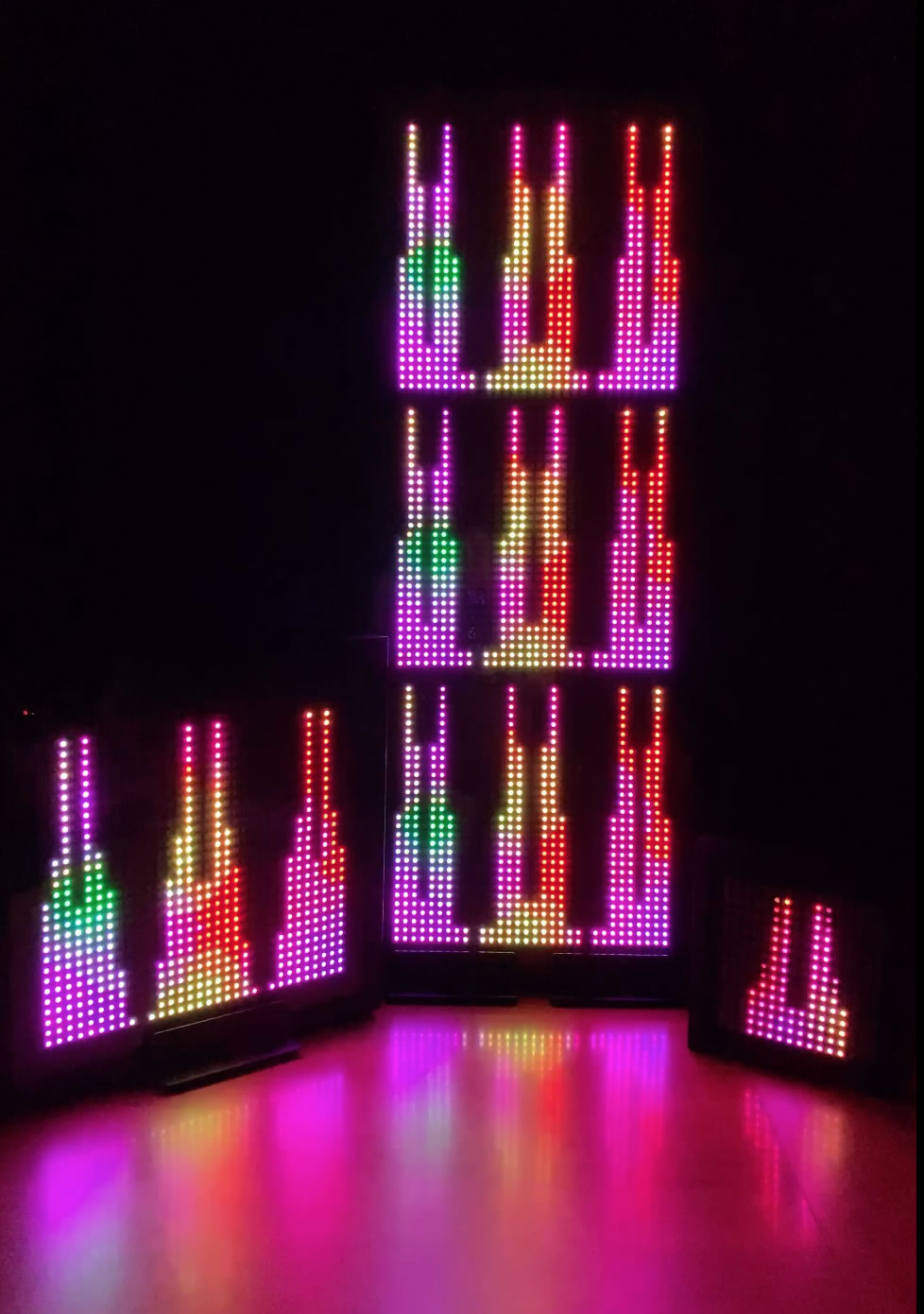 The video below shows the three panel types for Sit 'n Stare 2.0, beginning with a series of sound-reactive effects. The later part of the video (with no sound) shows the modes that do not respond to sound. To sync the panels and have them display similar animation modes at the same time, I am using the Enlighted iOS app, which communicates with a Bluetooth Low Energy (BLE) interface within each panel.