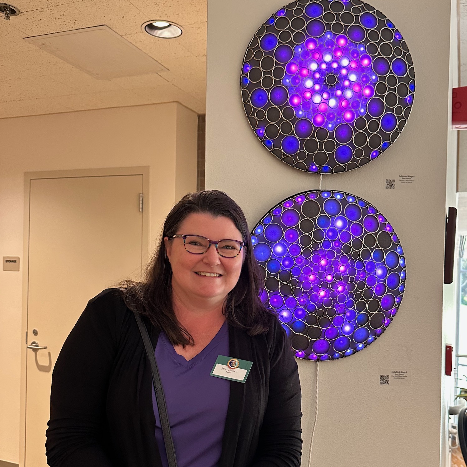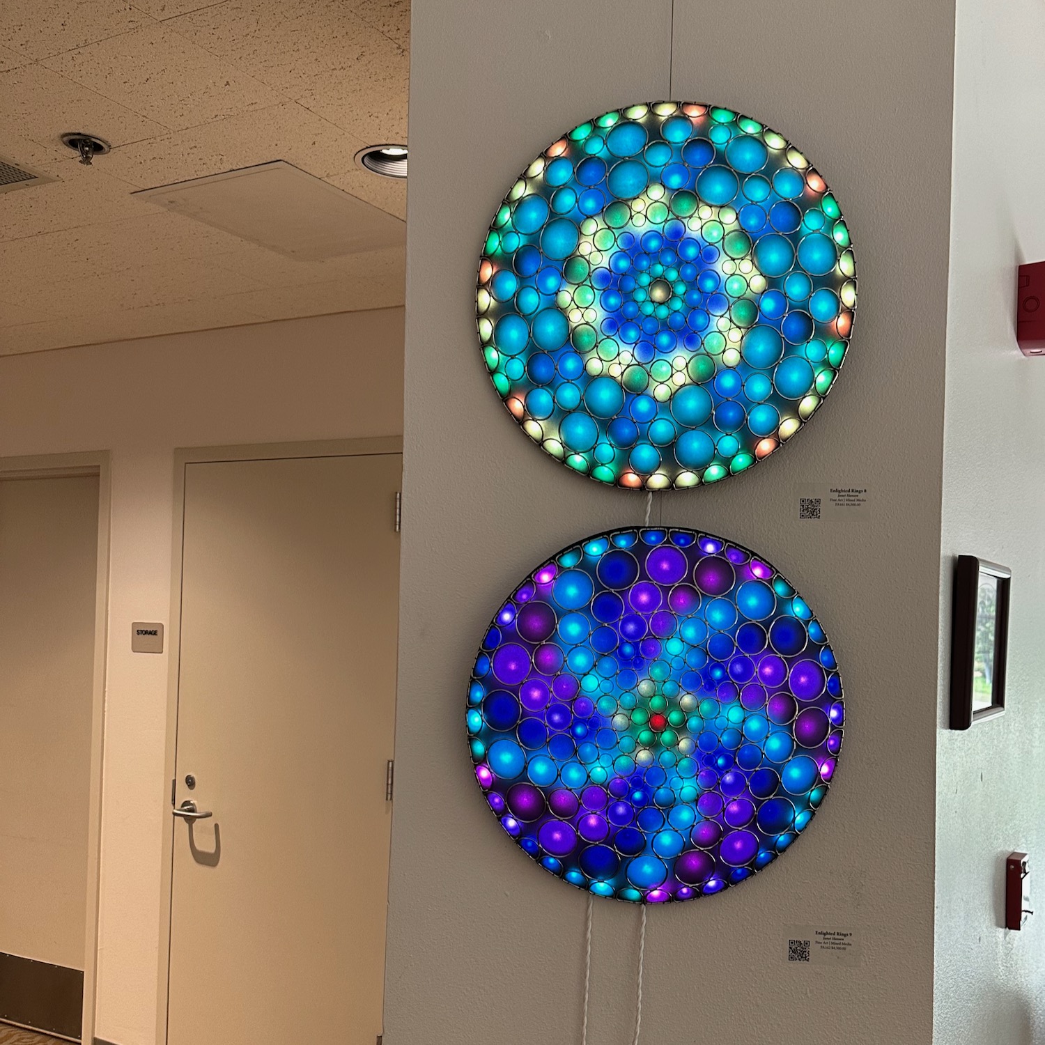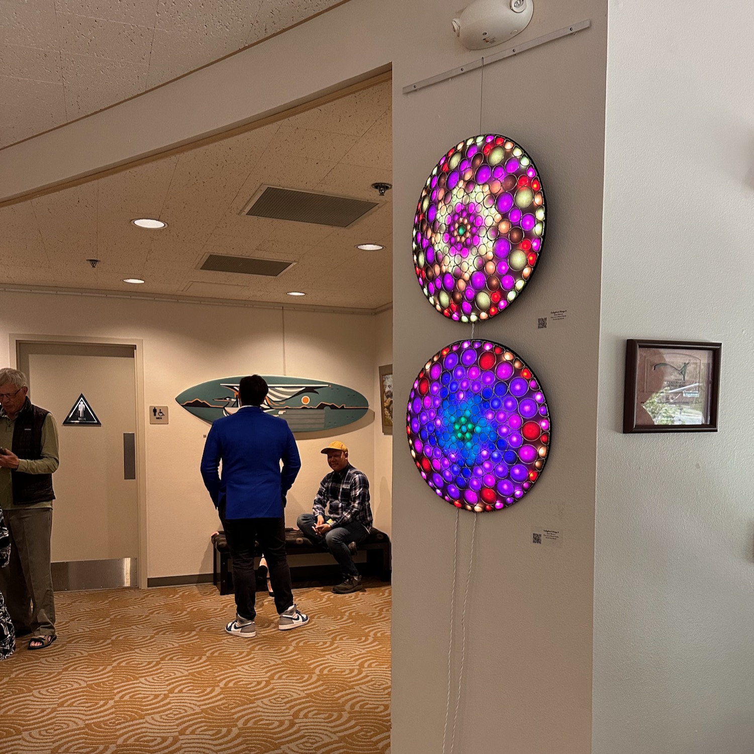 Two of my pieces were selected for the show: Enlighted Rings 8, and Enlighted Rings 9. While these are abstract pieces of mixed-media art, they relate to the ocean and air parts of the theme through the use of a color palette that is dominated by rainbows.
