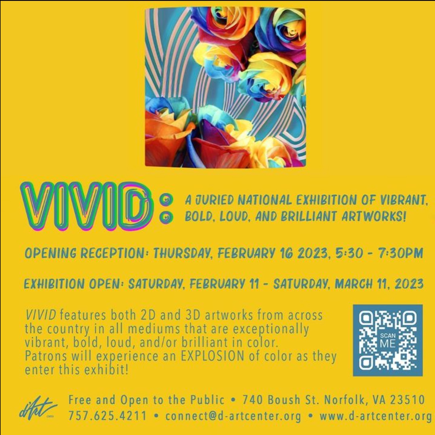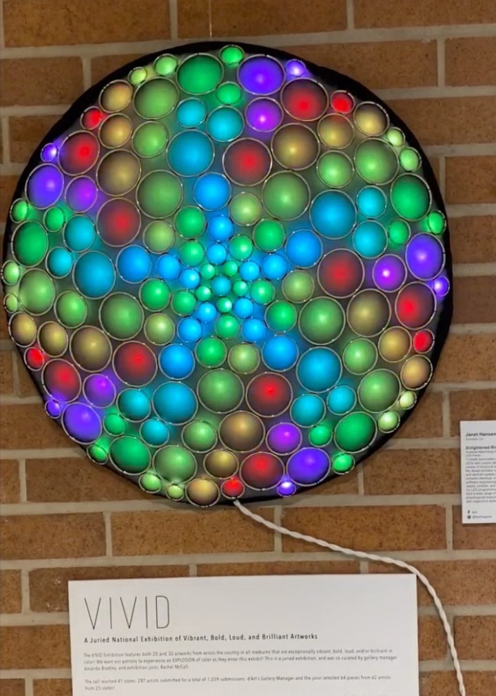 One of my pieces, Enlighted Rings 4, was selected for "VIVID: A juried national exhibition of vibrant, bold, loud, and brilliant artworks." The show was held at d'art Center's Main Gallery, located within The Center at 740 Boush St Norfolk VA, in the heart of the NEON Art District of Norfolk.
