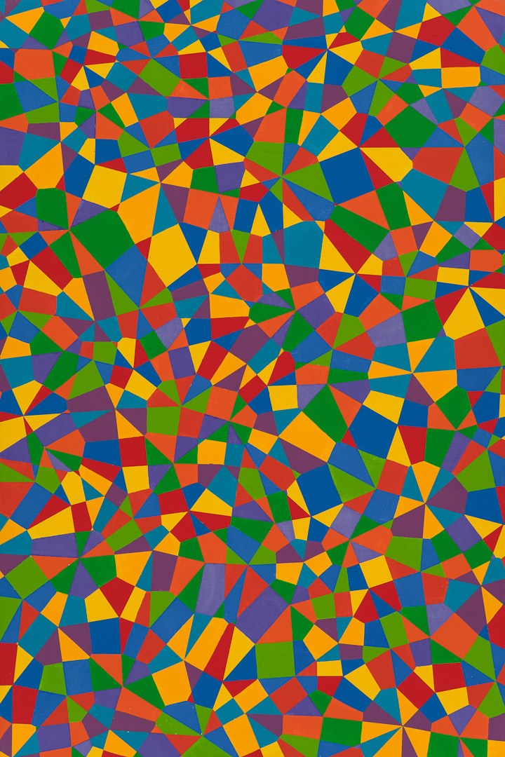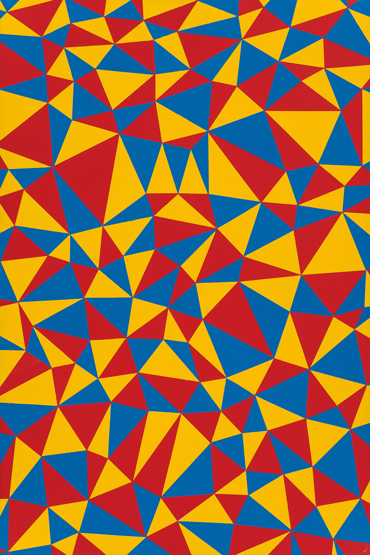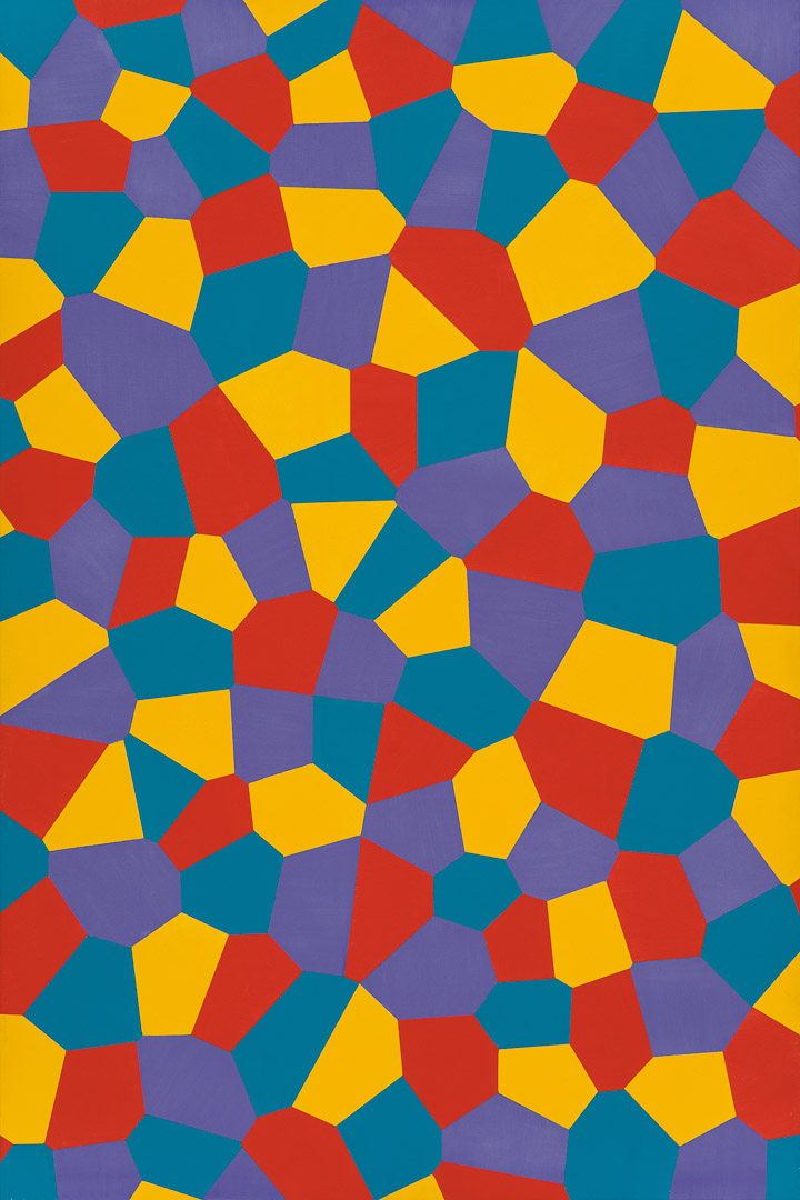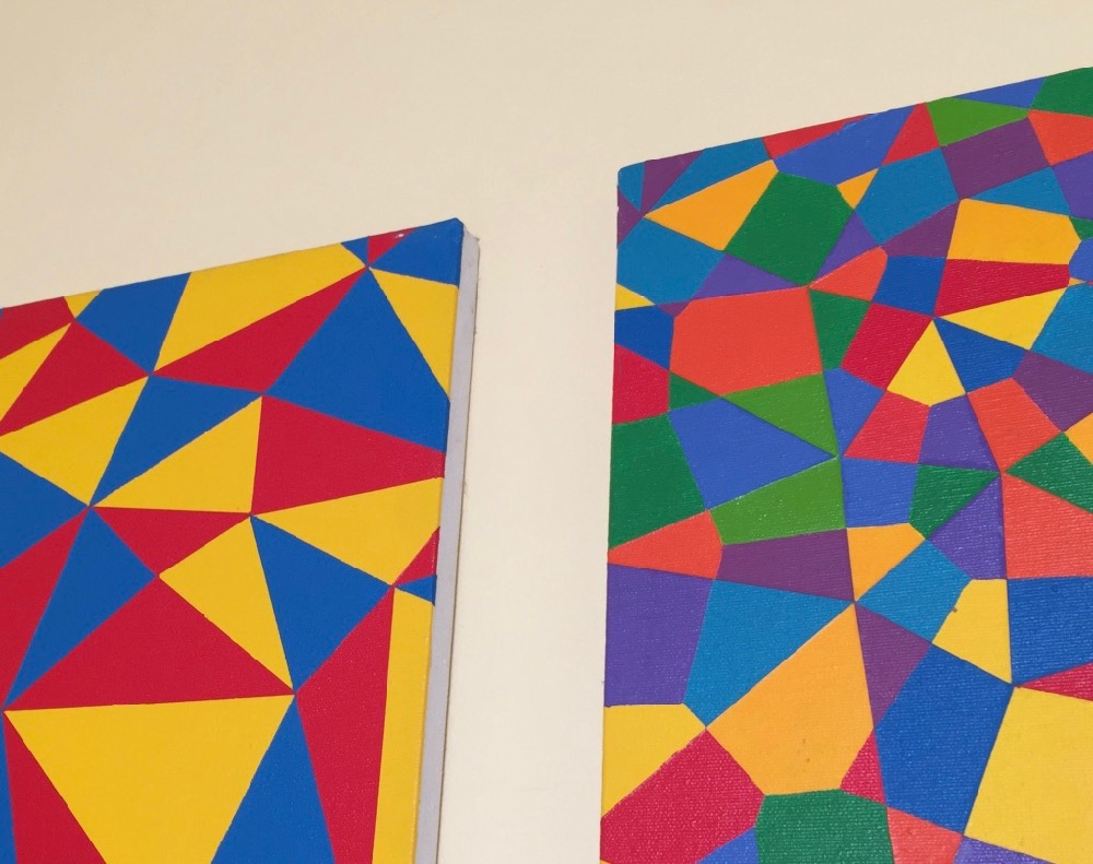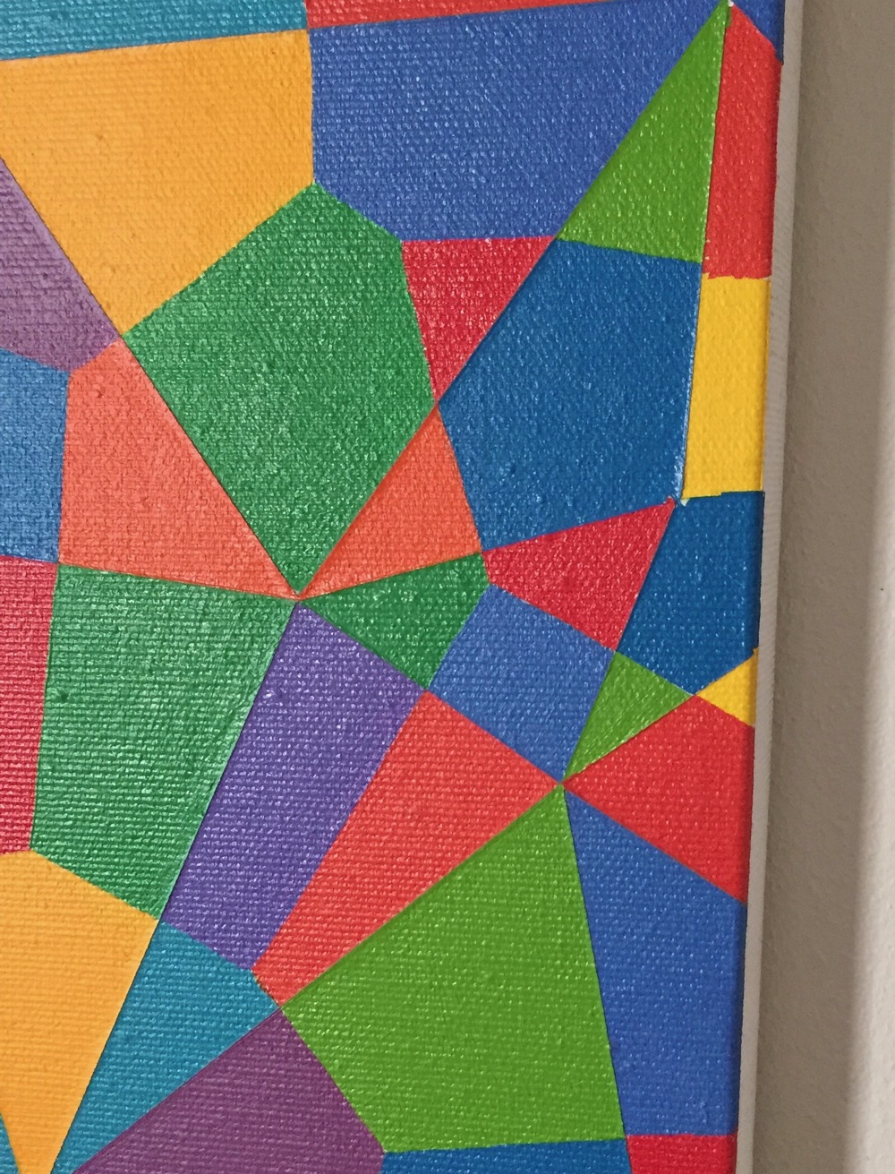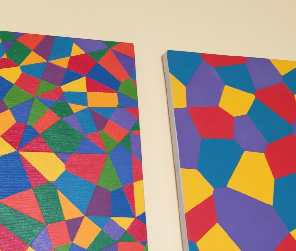 Overall, this piece uses twelve colors spaced equally on the color wheel. The triangulation is filled in with three colors, with no adjacent triangles having the same color. The Voronoi polygons are filled in with four colors. In the center panel, the color of each subdivided region is derived from a combination of the colors used for the same location in the left panel and the right panel. The total number of combinations is 3x4 = 12, the number of colors used.
