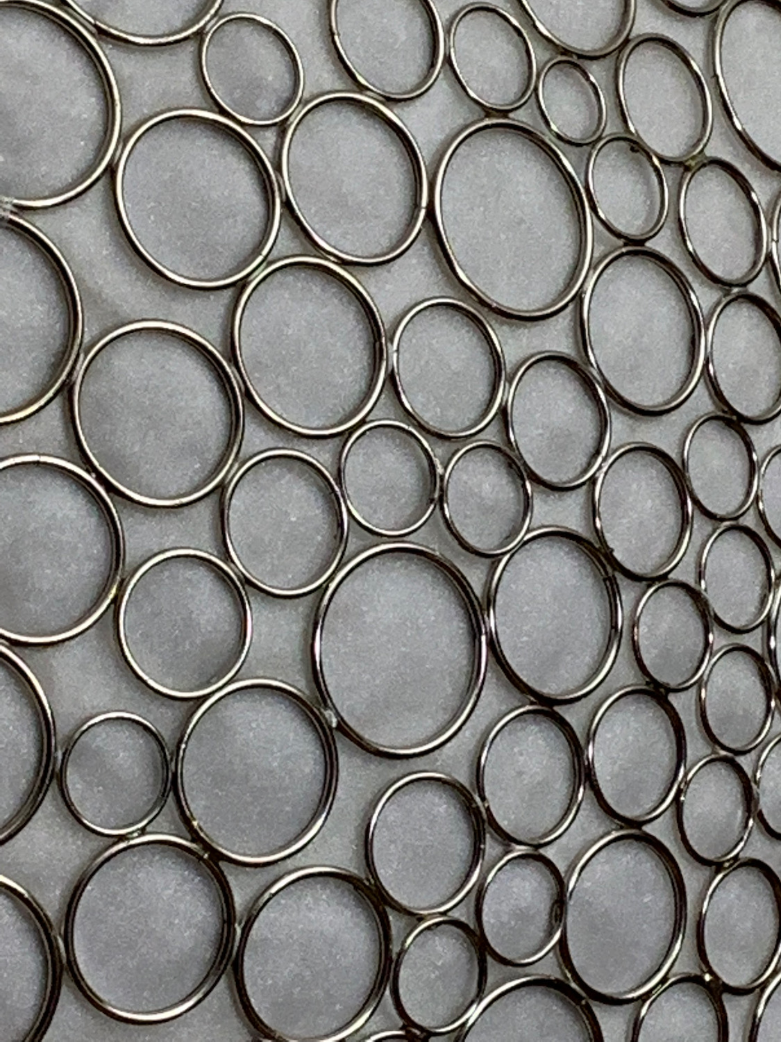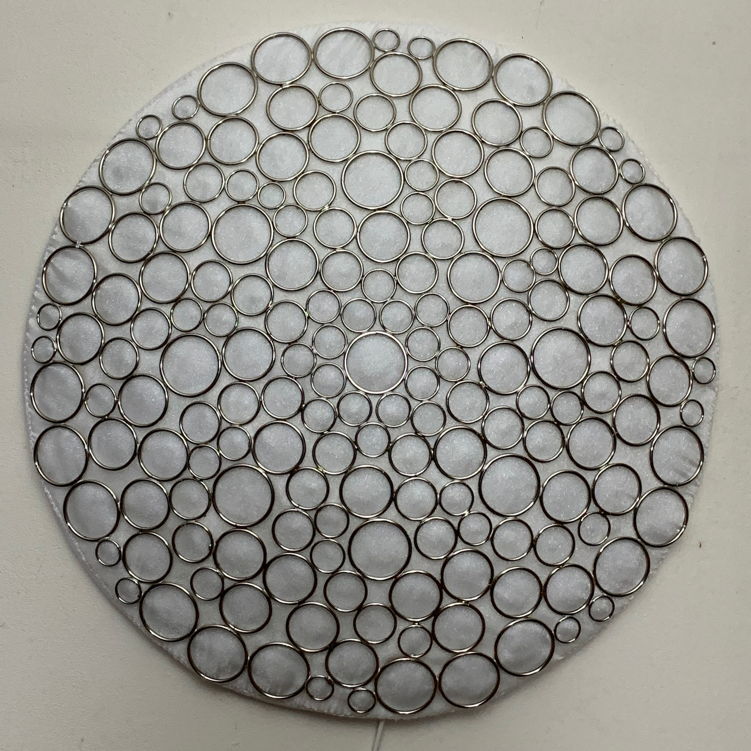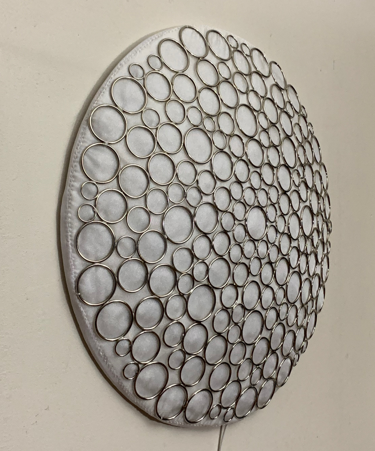 This piece is round, but arches out in the center in a shallow convex dome shape. The outermost layer is made of silver-colored soldered metal rings, and provides most of the structure. The rings are slightly different sizes, and fill in the dome with an 8-way repeating pattern. The back panel is covered in white fabric.