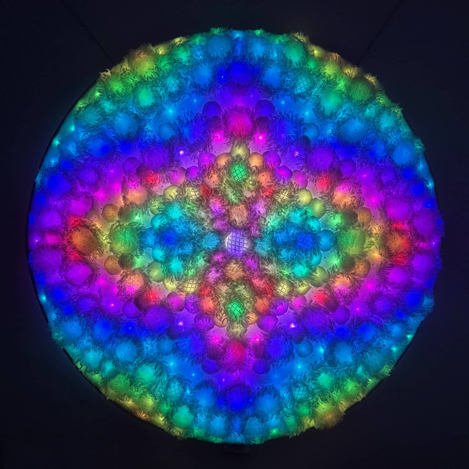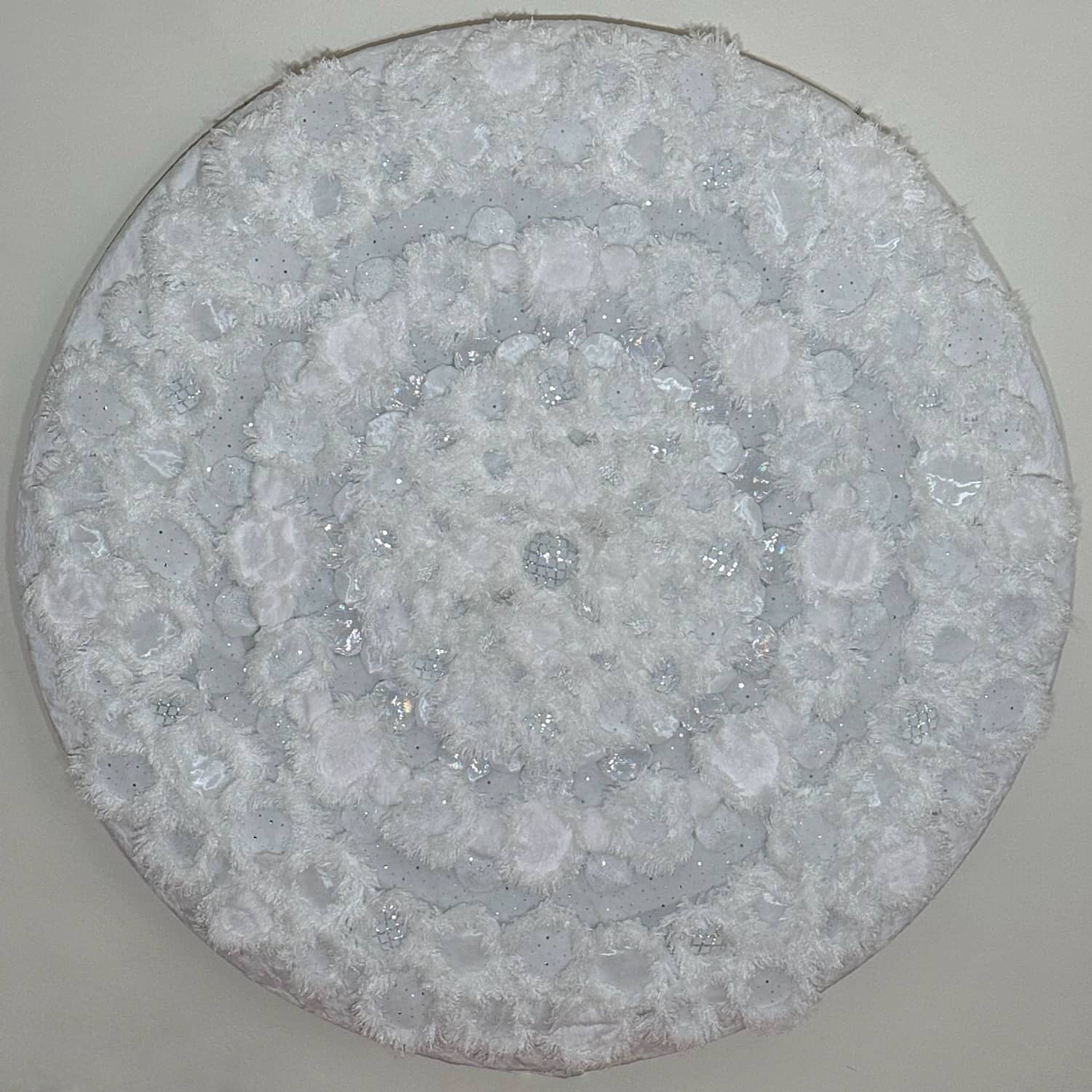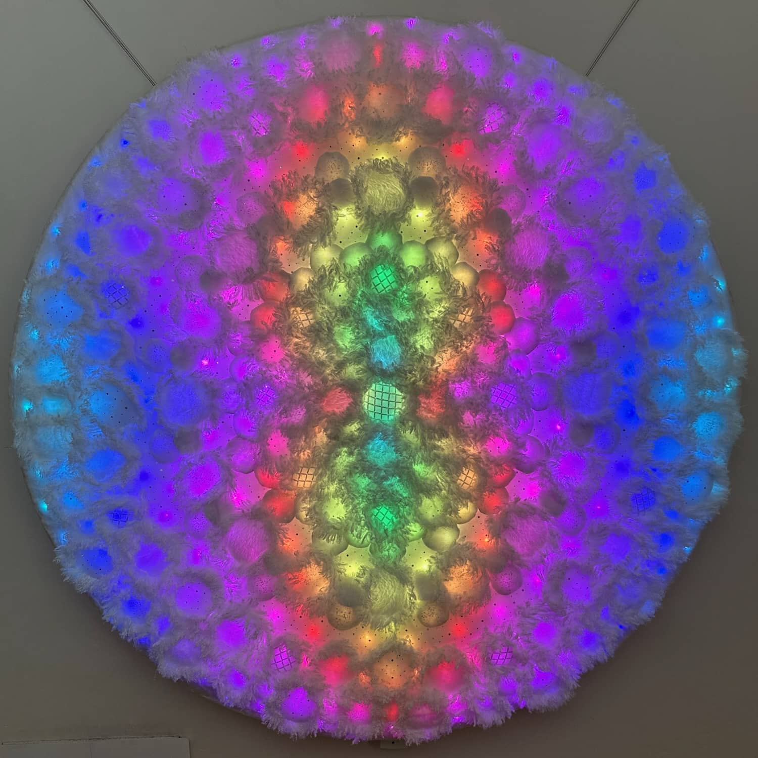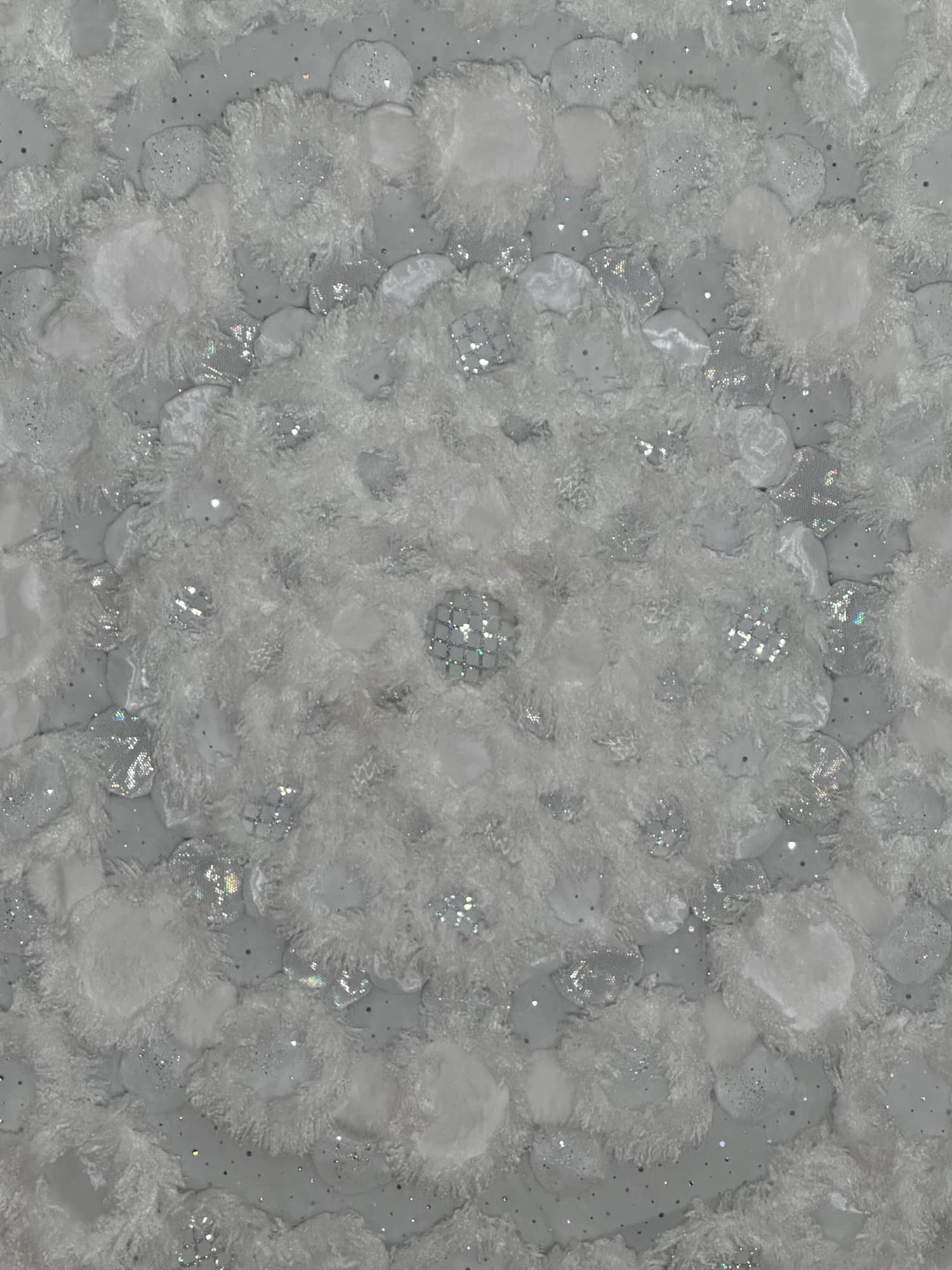 This is one of three parts of the Kaleidoscopic Comfort installation created for Mirror Mirror, the 2025 temporary art exhibition at the San Diego International Airport. The mixed-media wall-mounted art is illuminated by an internal layer of RGB LEDs arranged in a geometric pattern. The light is diffused by an assemblage of fabric shapes that are sewn together and aligned over the front of the LEDs. This piece uses a variety of white faux fur and sheer mesh textiles with some reflective accents.