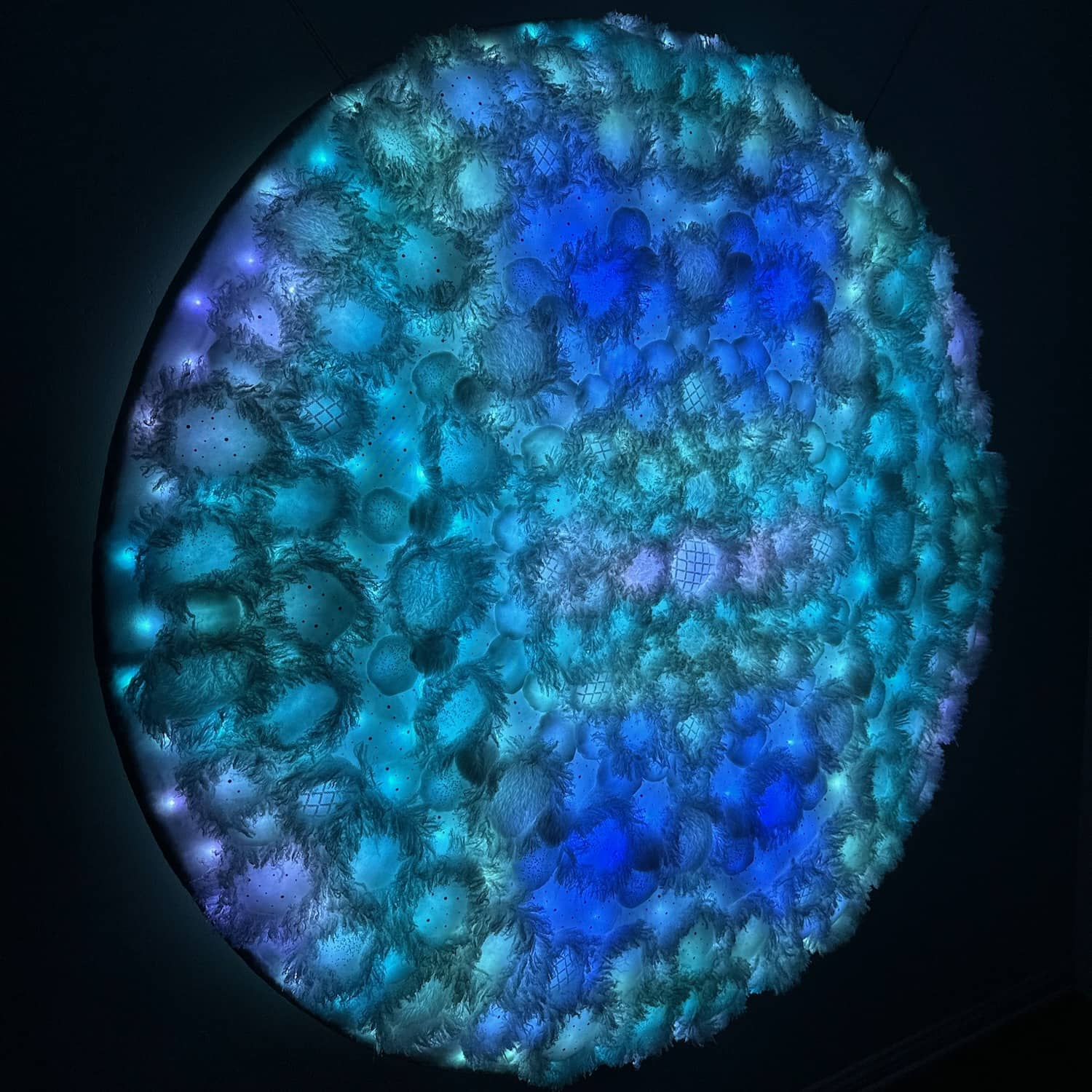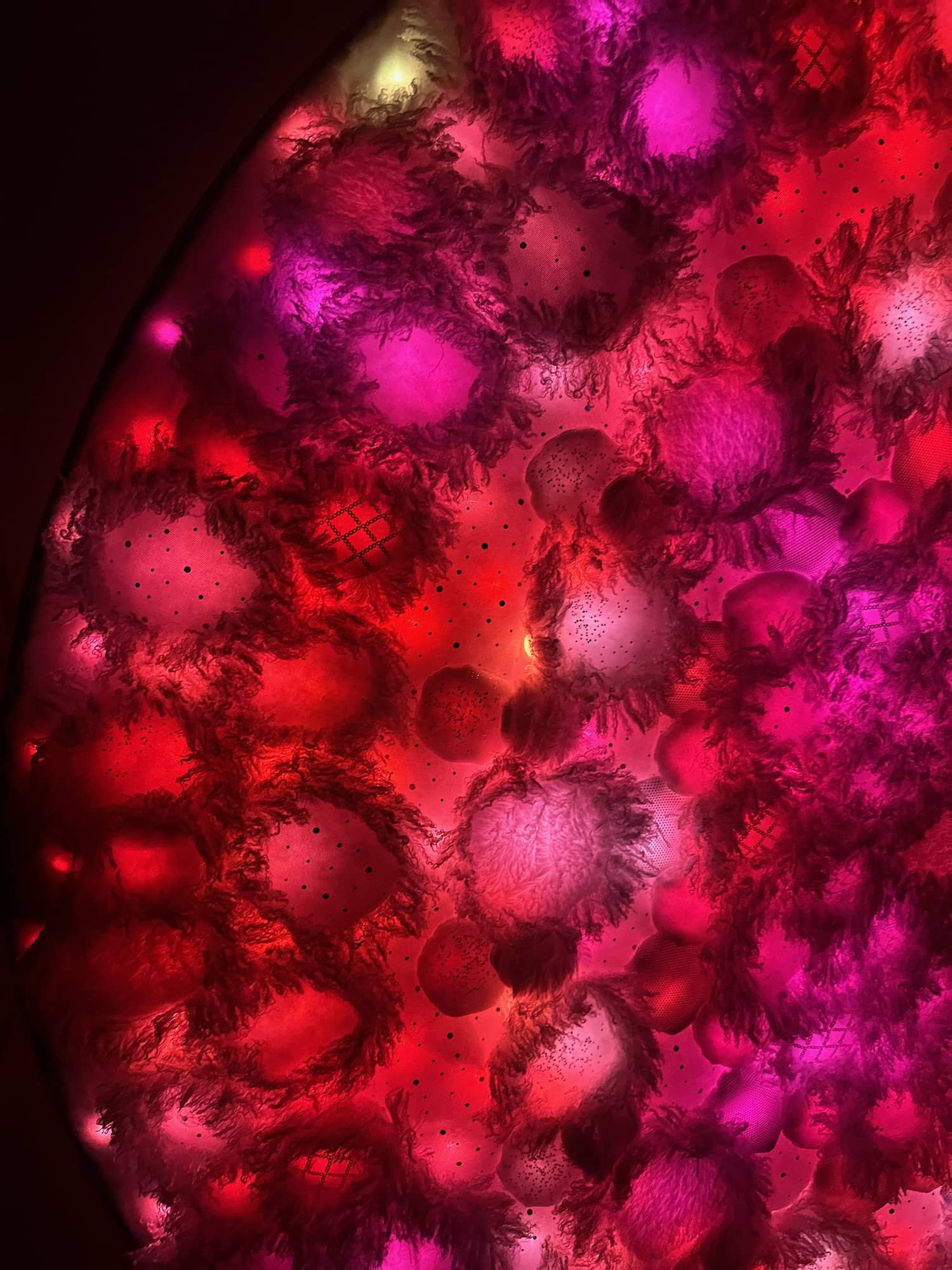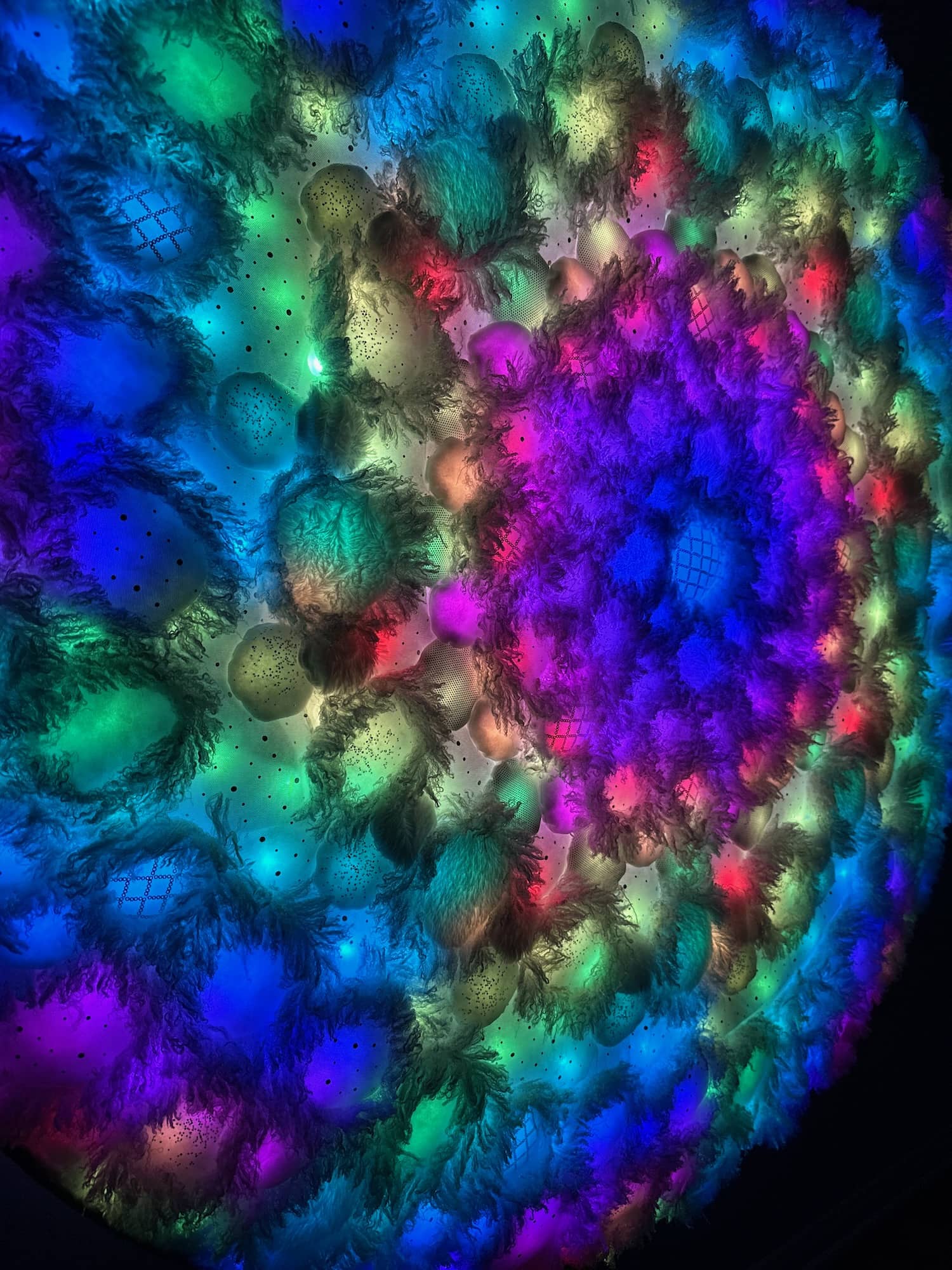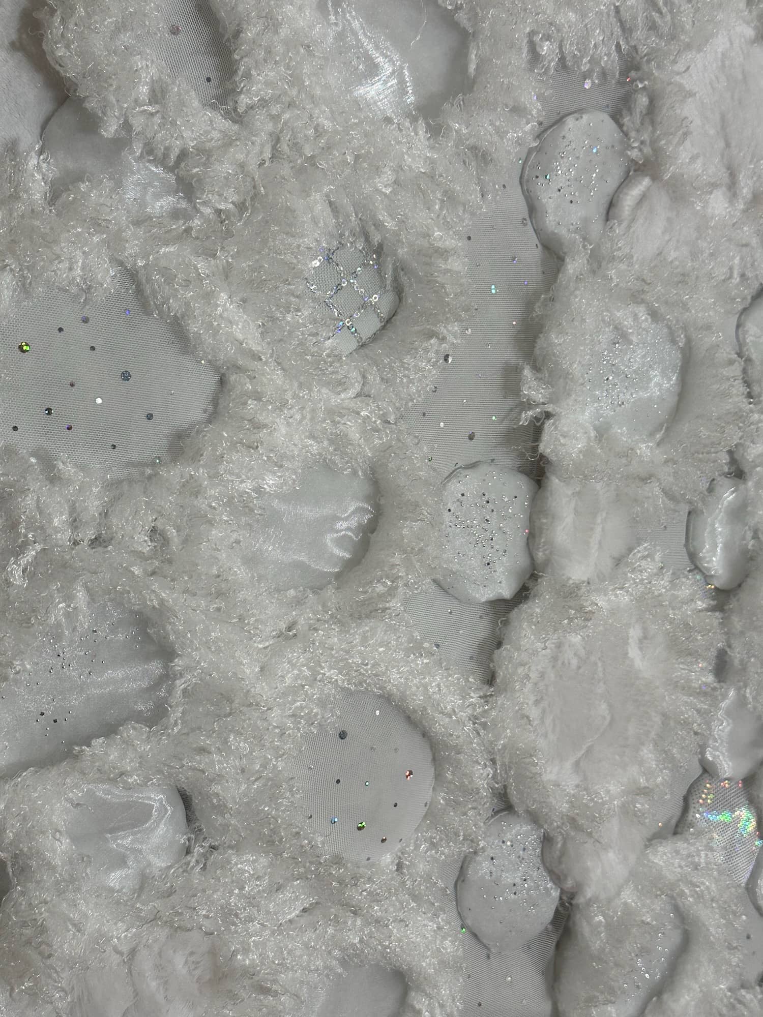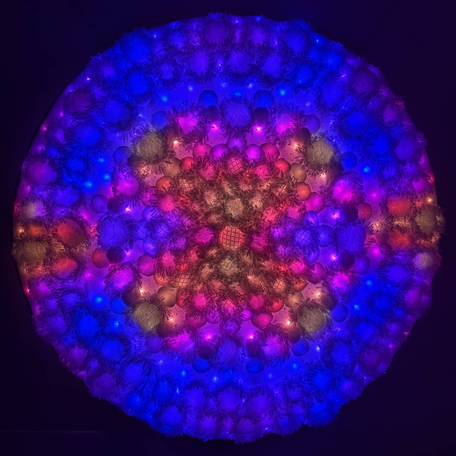 This is one of three parts of the Kaleidoscopic Comfort installation created for Mirror Mirror, the 2025 temporary art exhibition at the San Diego International Airport. The mixed-media wall-mounted art is illuminated by an internal layer of RGB LEDs arranged in a geometric pattern. The light is diffused by an assemblage of fabric shapes that are sewn together and aligned over the front of the LEDs. This piece uses a variety of white faux fur and sheer mesh textiles with some reflective accents.
