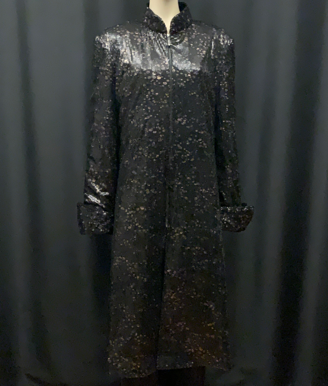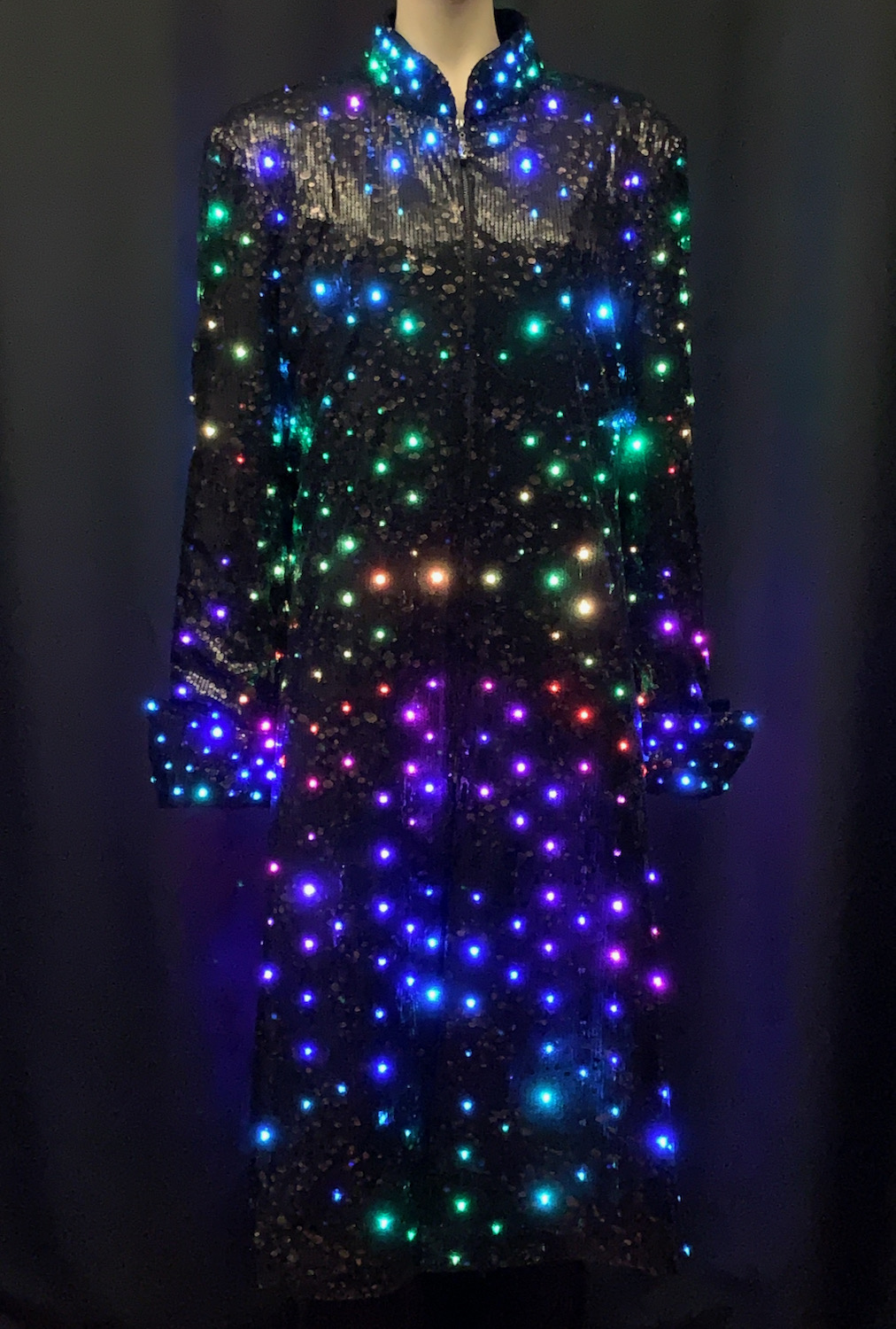This custom coat is decorated with over 1000 RGB LED pixels mounted on the front, back, arms and collar. The entire coat is covered with a sheer black mesh with mini sequins, to conceal the wiring while letting light pass through.