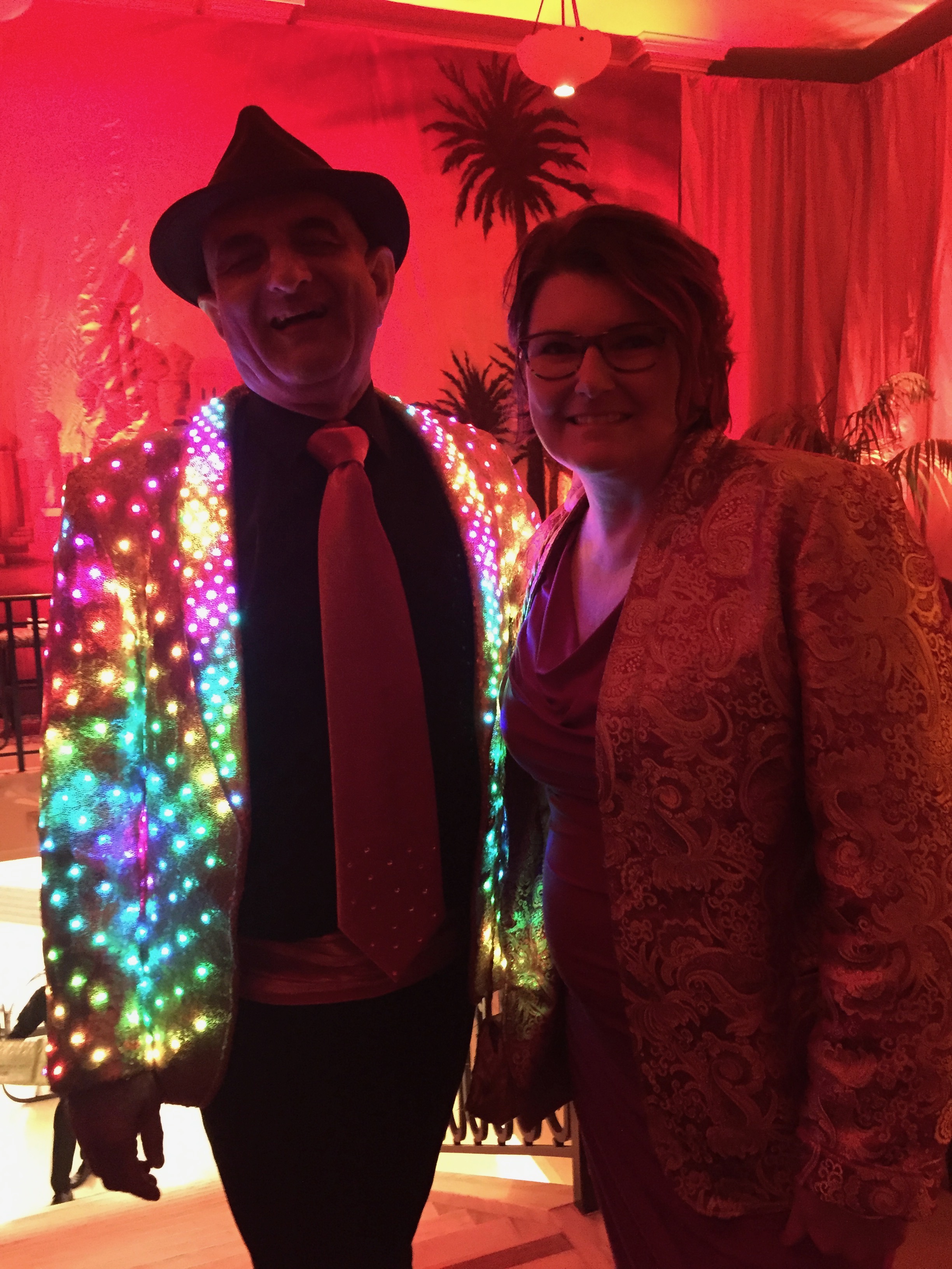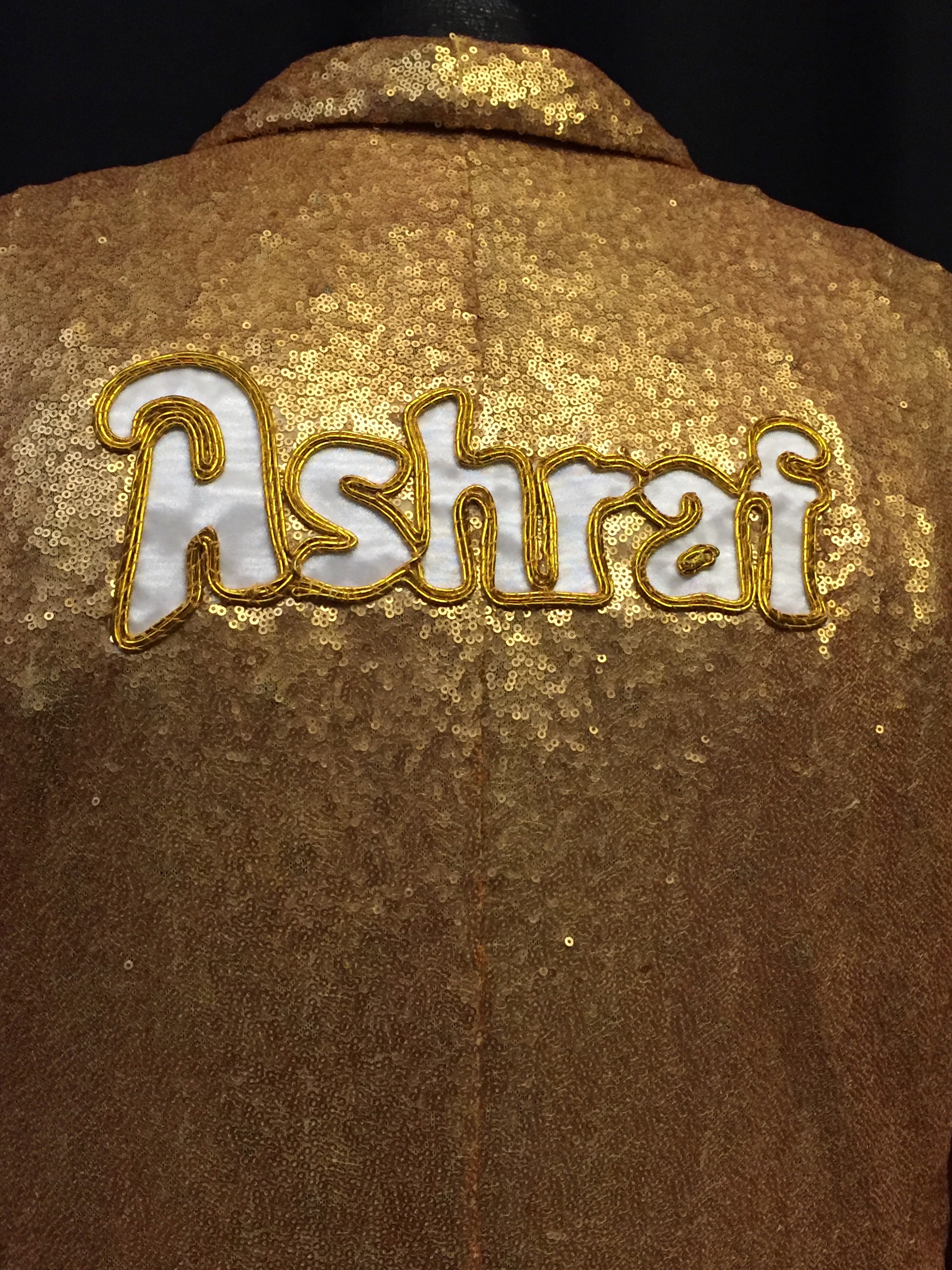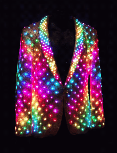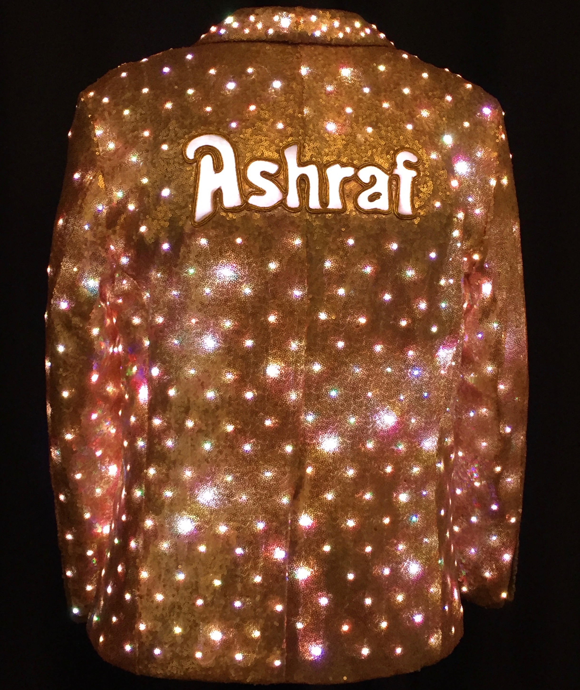 This custom jacket is decorated with about 1000 RGB LED pixels covering the front, back, arms and collar. The name 'Ashraf' is also illuminated on the back, with RGB LED backlighting behind sheer embroidered letters. The entire coat is covered with a sheer gold mesh with mini sequins, to conceal the wiring while letting light pass through.